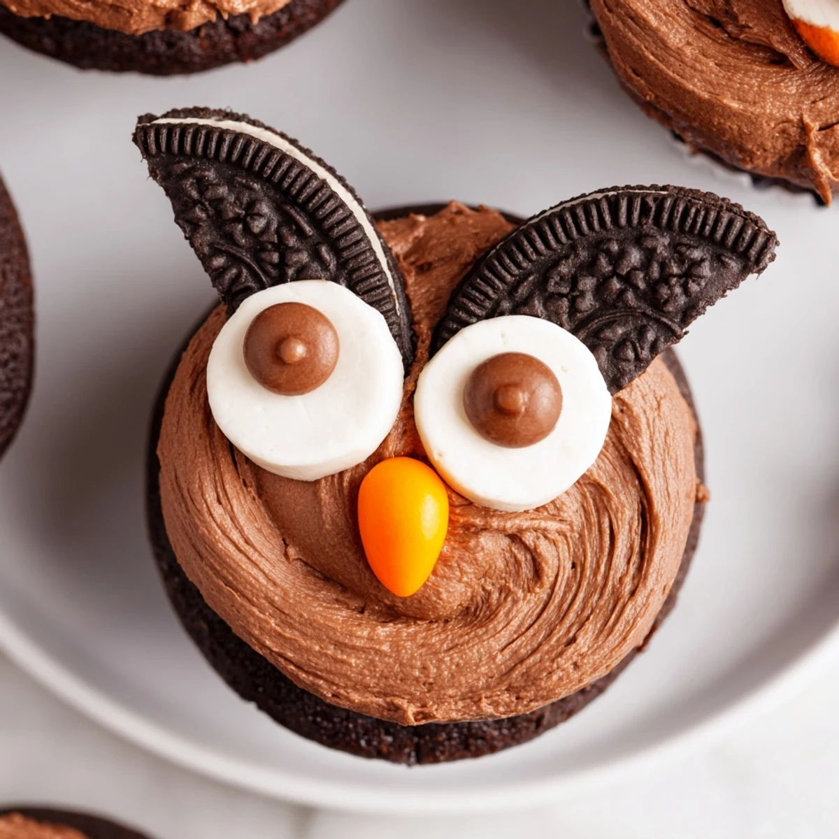 Transform ordinary chocolate cupcakes into adorable owl creations with this simple decorating technique. Rich cocoa cupcakes are topped with velvety chocolate buttercream, then transformed into whimsical owls using twisted Oreo cookies as eyes and colorful chocolate candies for features. The entire process takes under 40 minutes and yields 12 charming treats that are perfect for children's birthdays, school events, or autumn gatherings.